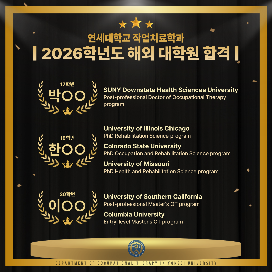 - [2026학년도 연세대학교 작업치료학과 졸업생 해외 대학원 합격]